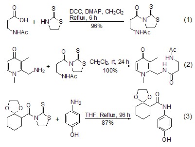 1,3-thiazolidine-2-thione and carboxylic acid can form amides in the presence of the condensation reagent dcc, or can also form amides with acid halides in the presence of triethylamine and dmap. the generated amide derivatives and amino compounds can be left at room temperature under neutral conditions or heated together to make 1,3-thiazolidine-2-thione leave and generate new amides. this reaction is also often used in the reaction of macrocyclic compounds, generally giving very satisfactory yields [3]. if there are different functional groups, it also shows a high degree of chemical selectivity (formula 1~formula 3)[4,5].