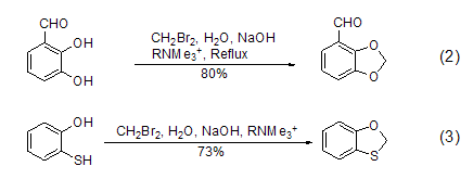 similar reactions can also use other phase transfer catalysts such as alkyltrimethylammonium are used to achieve the methylene carboxyformylation reaction of catechol (formula 2)[2] and the monosulfide carboxyformylation reaction of mercaptophenol (formula 3)[3].