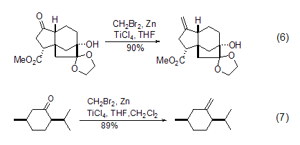 dibromomethane with zn and ticl4 can convert the carbonyl group c=o into c=ch2 with high yield under mild conditions. it is an effective methylene reagent for carbonyl compounds. . the biggest advantage of this mixed reagent compared with the traditional wittig reagent is that it does not cause the enolization reaction of ketones, so it is very widely used, such as the synthesis of natural products (formula 6)[6] and ordinary chiralityconversion of reagent (formula 7)[7].