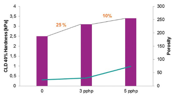 unlike other hardening additives on the market, nt h18 can significantly increase the hardness without affecting the pore structure of the foam. when nt h18 is added to the formulation, there is no need to change the amount of tdi or tin to maintain the open cell structure. the amount used is 1 to 5 pphp, depending on the desired increase in hardness. depending on the foam density, formulation and production parameters, it is possible to increase the hardness by up to 35% without significantly changing the pore structure.