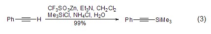 for terminal alkynes, in under the action of lithium, zinc reagents, etc., terminal alkynes can directly interact with tmscl to generate silane compounds (formula 3)[3,4].